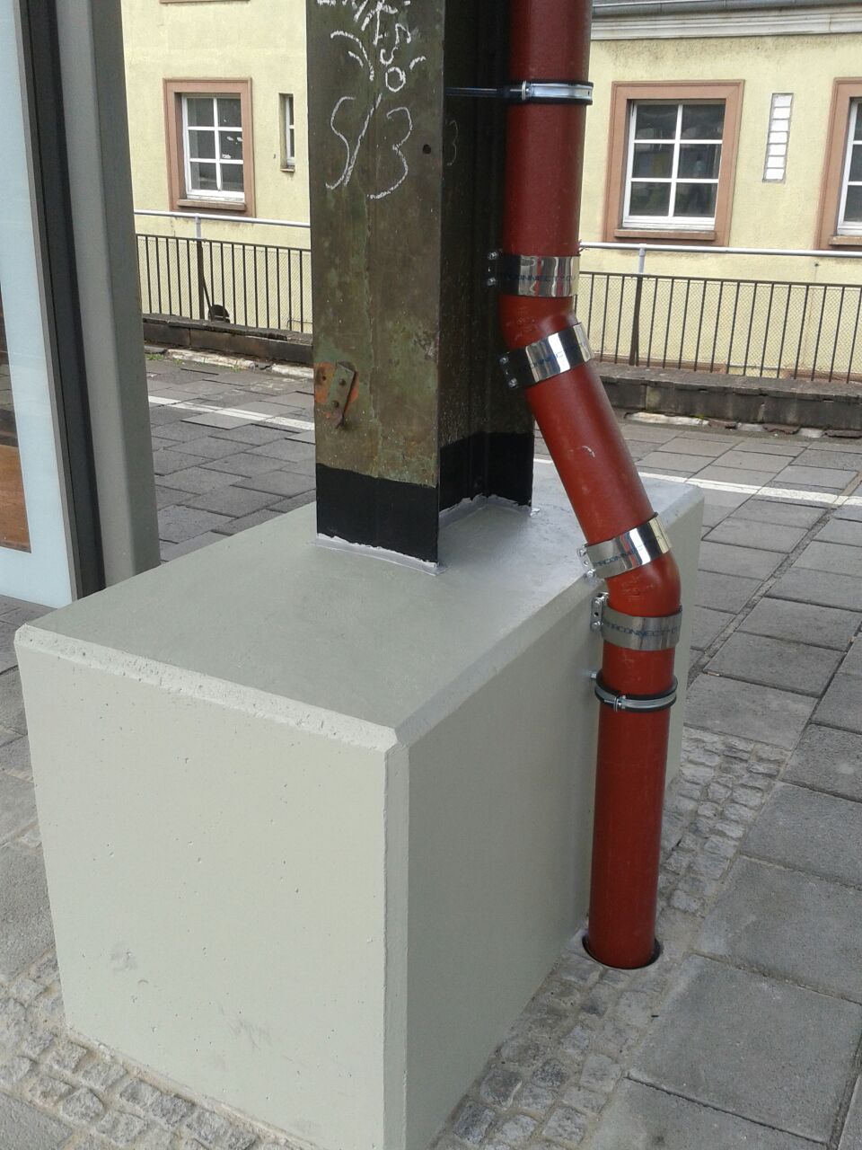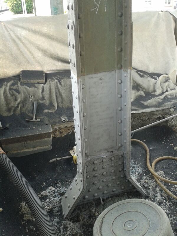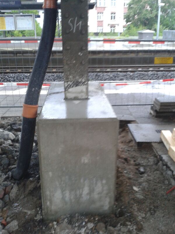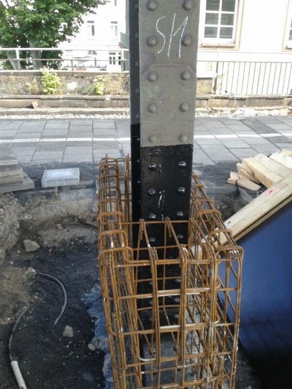 Sanierung von 9 Hauptdachstützen und 4 Nebendachstützen. Freilegen des alten Fundaments, Abstemmen, Stahlträger abstrahlen, neuer Schutzanstrich und Aufbau eines neuen Betonfundaments bis 1 m Höhe inkl. Bewehrung.